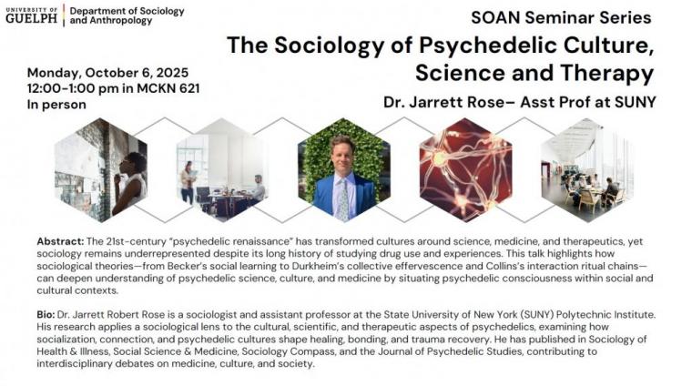 SOAN Seminar Series - Dr. Jarrett Rose Monday, October 6th, 2025 12:00 PM to 1:00 PM Dr. Jarrett Rose– Asst Prof at SUNY The Sociology of Psychedelic Culture, Science and Therapy